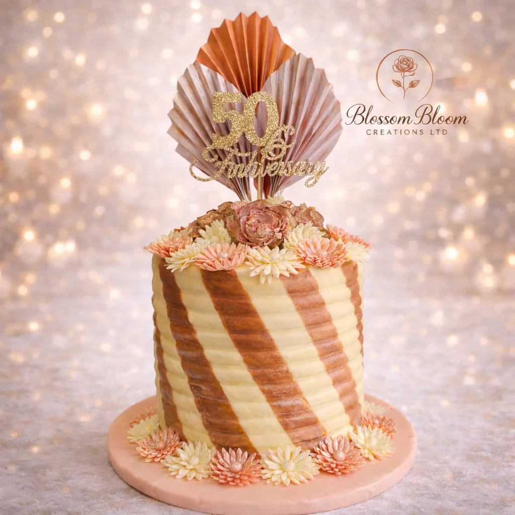 Celebrate a golden milestone in style with our luxury birthday, anniversary cake, beautifully handcrafted with icing sugar flowers and elegant buttercream detailing and sophisticated floral accents. Designed in warm peach and champagne tones, this cake features a stunning gold “50th Anniversary” topper, making it the perfect centrepiece for unforgettable celebrations.