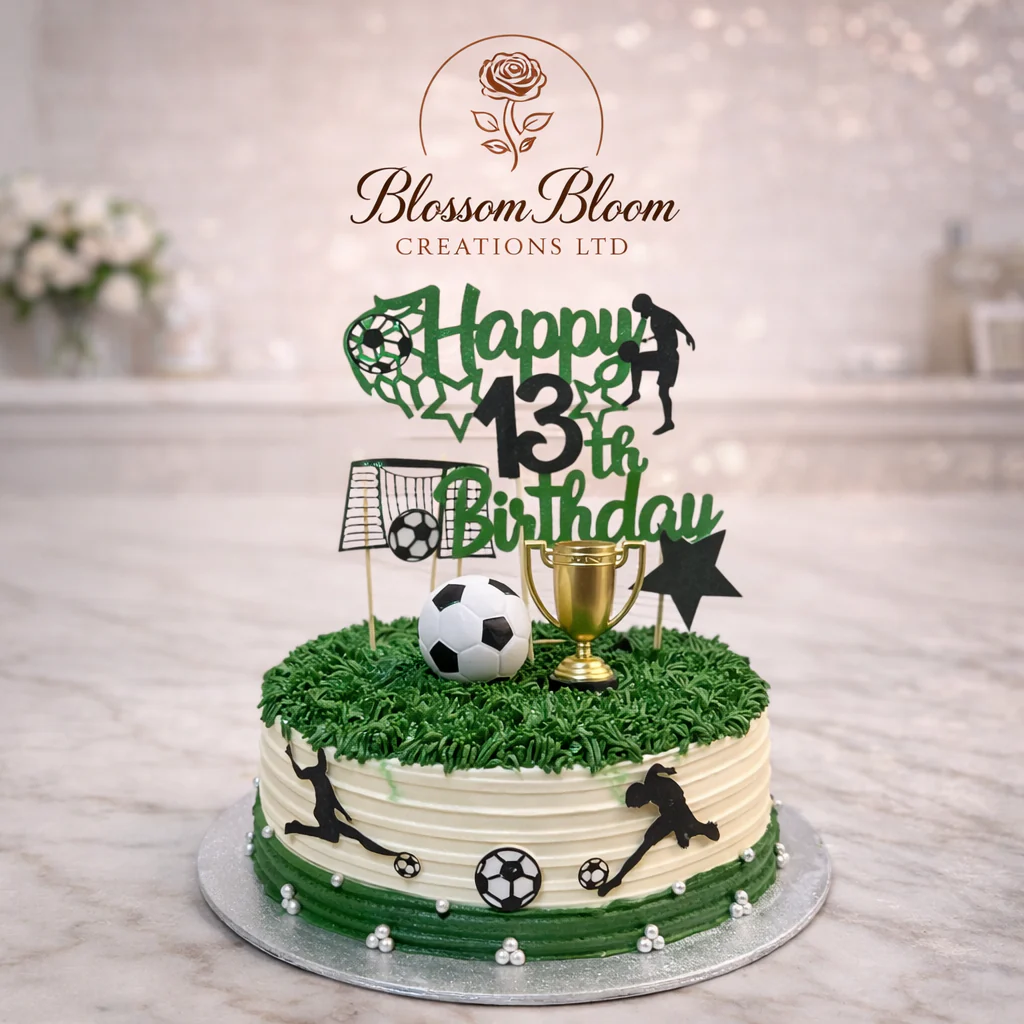 Score big on their special day with our vibrant Football Theme Birthday Cake, perfect for sports lovers and young football fans. Expertly handcrafted with a realistic grass-effect buttercream finish, this cake is decorated with football toppers, goal posts, and a trophy for a fun and exciting look. Finished with a personalised “Happy Birthday” message and age detail, it’s the ultimate centrepiece for a memorable celebration.
