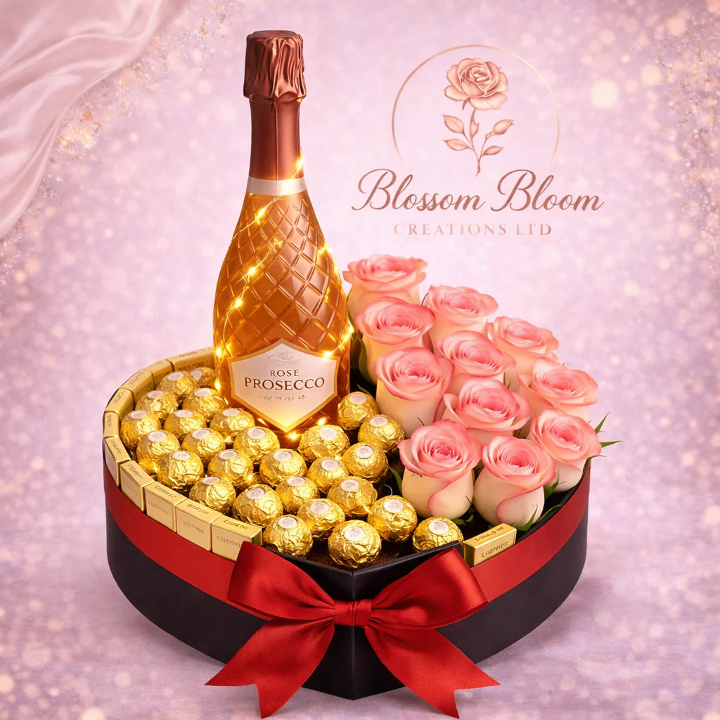Luxury Rose Prosecco & Chocolate Heart Gift Box – Romantic Gift Hamper UK