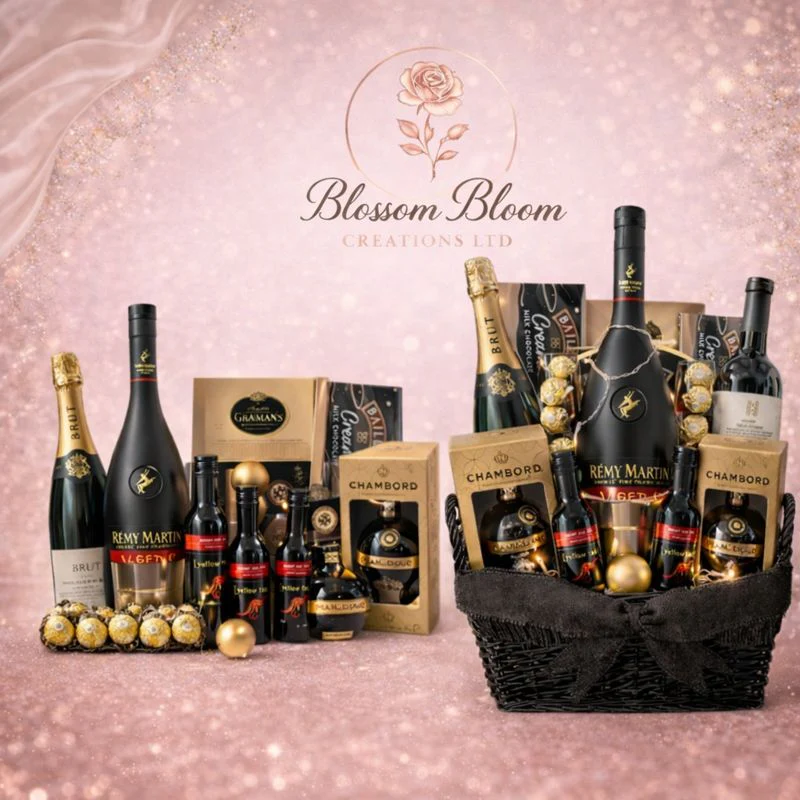 Indulge in pure luxury with our Prestige Gold Celebration Hamper, a premium handcrafted gift experience curated by Blossom Bloom Creations Ltd. This exquisite arrangement features an elite selection of fine spirits, chocolates, and festive décor — making it the perfect centrepiece for special occasions.